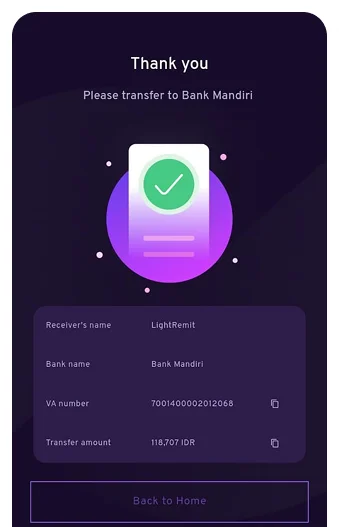 Once you’ve set up your transfer on LightRemit, you can pay directly through your bank. It’s a straightforward and cost-efficient option for sending money abroad.